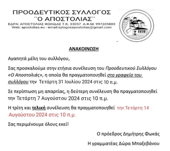 Στις 7-8-2024 πραγματοποιήθηκε στον προαύλιο χώρο του κοινοτικού μας καταστήματος η Δ’ Γενική Συνέλευση του συλλόγου μας, με σκοπό την ενημέρωση των μελών και τη χάραξη νέων δράσεων.