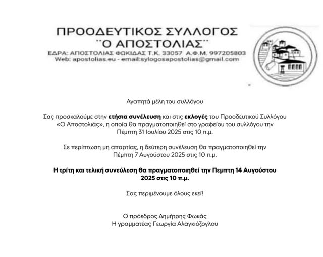 Στις 14-8-2025 πραγματοποιήθηκε στον προαύλιο χώρο του κοινοτικού μας καταστήματος η Ε’ Γενική Συνέλευση του συλλόγου μας, με σκοπό την ενημέρωση των μελών και την εκλογή νέου Διοικητικού Συμβουλίου κι Εξελεγκτικής Επιτροπής.