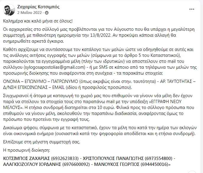 Στις 13-8-2022 πραγματοποιήθηκε στον προαύλιο χώρο του κοινοτικού μας καταστήματος η Β’ Γενική Συνέλευση του συλλόγου μας, με σκοπό την ενημέρωση των μελών και την εκλογή νέου Διοικητικού Συμβουλίου κι Εξελεγκτικής Επιτροπής.